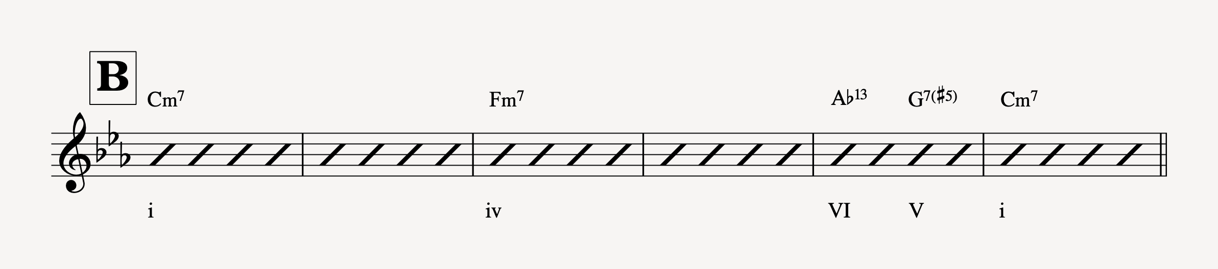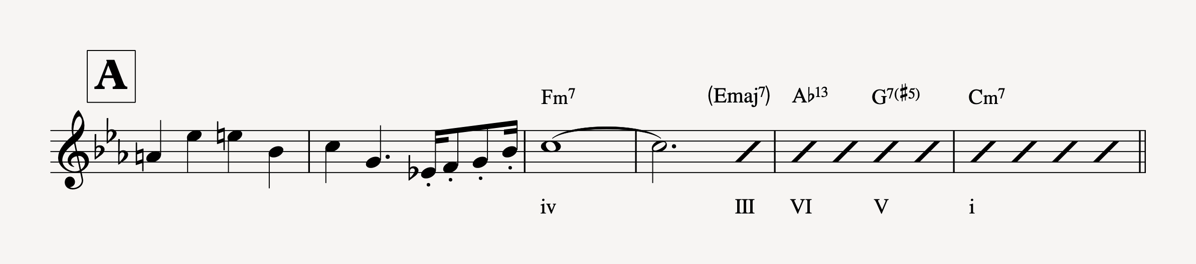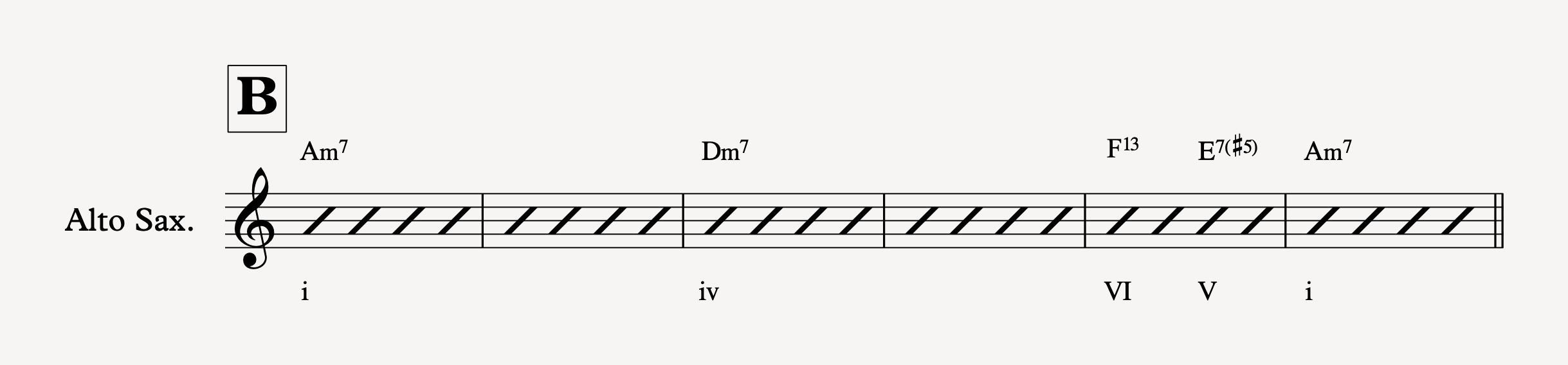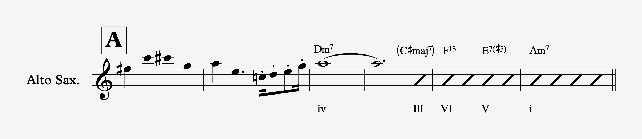 N.B. Since it prominently features alto sax — an E-flat instrument — I’ve provided the dots for this song in both concert pitch C minor and transposed to A minor.