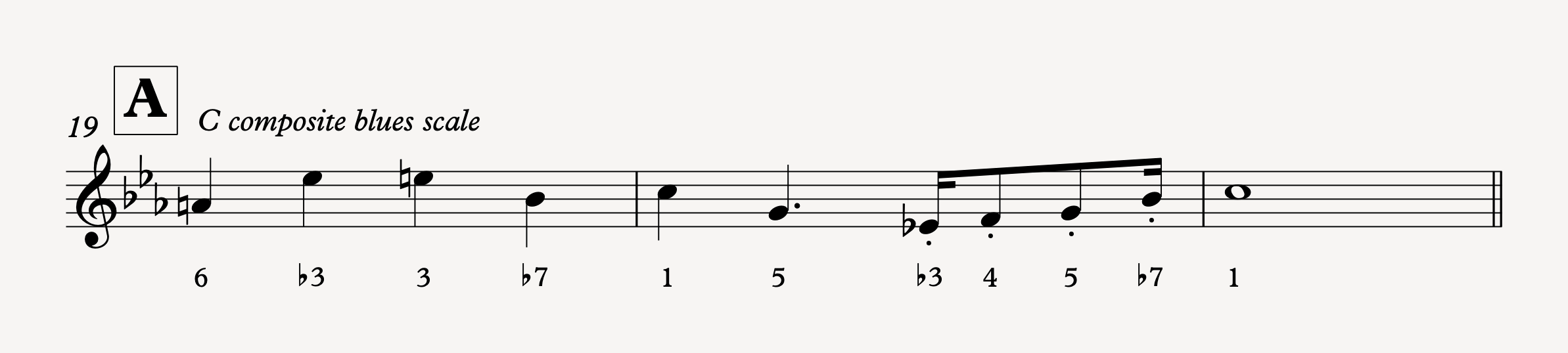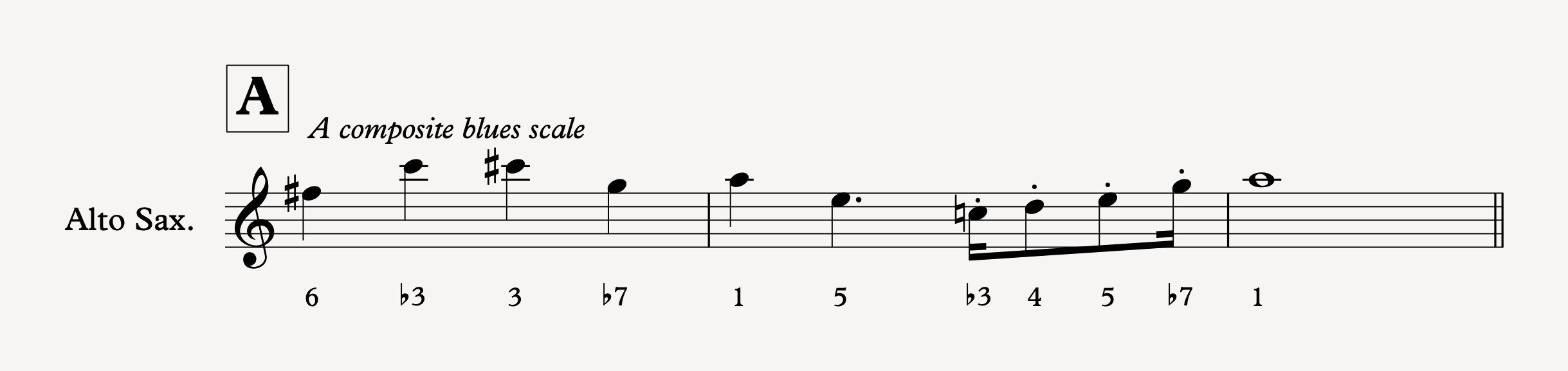 So are we in C major or C minor? Well, exactly. These tune’s head features tensions that suggest neither C major or minor, but something in between, using the composite blues scale (which combines the notes of the minor blues scale with the major pentatonic : 1, 2, b3, 3, 4, b5, 5, 6, b7). This is fitting given the album’s focus on the inheritance of black American culture, since these are some of the blue notes that form the bedrock of American music styles devised by black artists, from blues and ragtime to jazz and gospel. This riff opens each of the choruses for the A section, with Martin (on alto sax) and Marlon Williams (on distorted electric guitar) play a series of tensions and resolutions against that implied bass note of C.