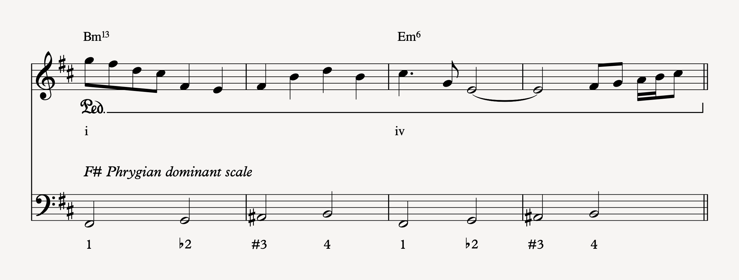 A modal analysis of the harmony would place us in F# Phrygian Dominant. Since the bassline starts on F#, the first chord voicing could be understood as F#sus4(b6, b9) (voiced 7–1–4–5–b6–1–b9), which is then followed by an F#sus4(b9) chord (voiced 4–b9–5). But breaking down the voicings like this means they both lack a third; and while having one chord without a third is acceptable, if all your chords lack a third, you’re probably thinking in the wrong key. By comparison, a tonal analysis of the harmony places us in the key of B minor, with the bassline drawing on the B harmonic minor scale. The chords begin on the i (Bmin13) and move to the iv (Emin6), but the bassline begins on the dominant F# and ends on the tonic of B. While the bassline outlines a perfect cadence, the chords do the opposite, creating tension that never resolves but simply loops over and over again. Once we add Thundercat, Sounwave, Flying Lotus and Flippa’s rubbery improvisations over the top, it becomes clear that this structure is a subversion of how pedal points are usually used in jazz: whereas the bassist would usually play a pedal while the rest of the band goes crazy, here, the broken chords on the electric piano act as a pedal point for Thundercat’s bassline, which slithers all over the place.