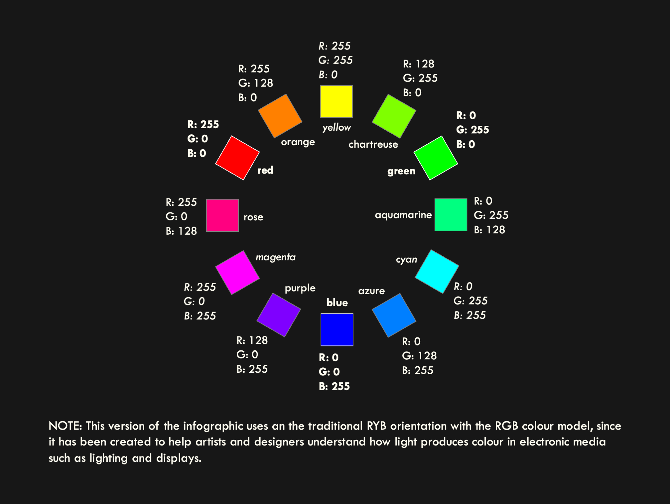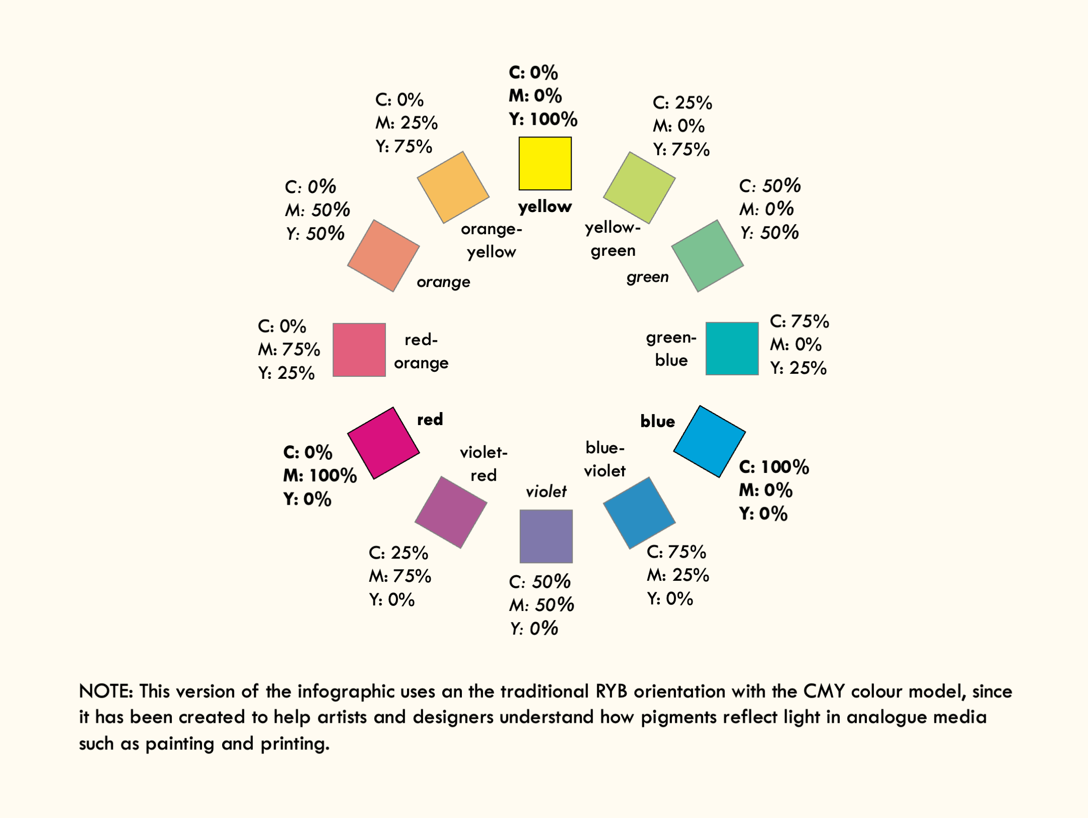 The traditional model is an ancestor of subtractive colour. It uses less precisely defined hues of red, yellow and blue, leading it to be dubbed the RYB model. This model existed before we had the modern scientific understanding of how light affects colour, so it is an outdated heuristic, since it is a ‘best guess’ approach that bears some similarity to CMY, but lacks the mathematical accuracy around how those colours are calibrated. Despite this, many people still find it useful to think in terms of the RYB colour wheel since this is how artists have approached colour theory for centuries.