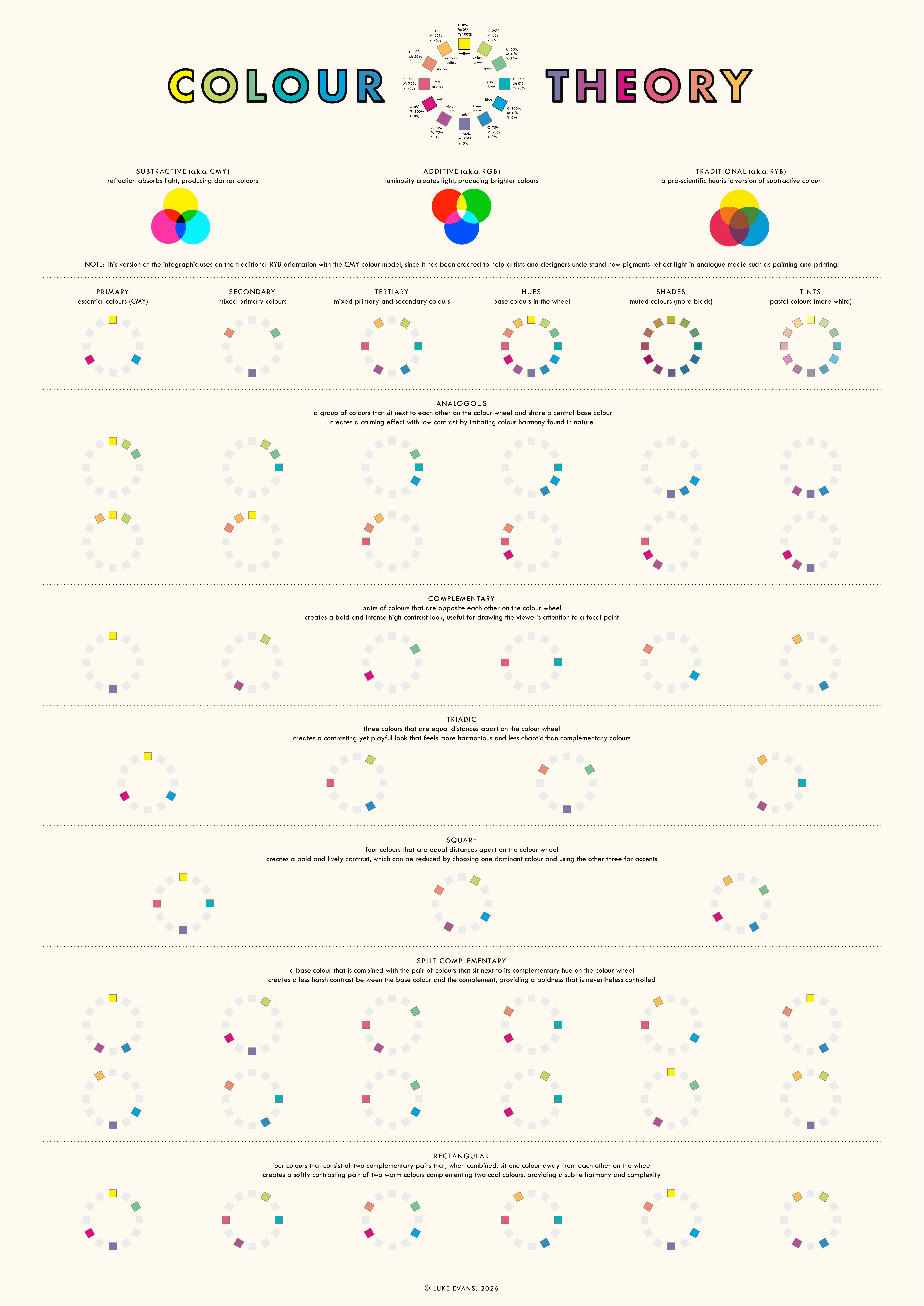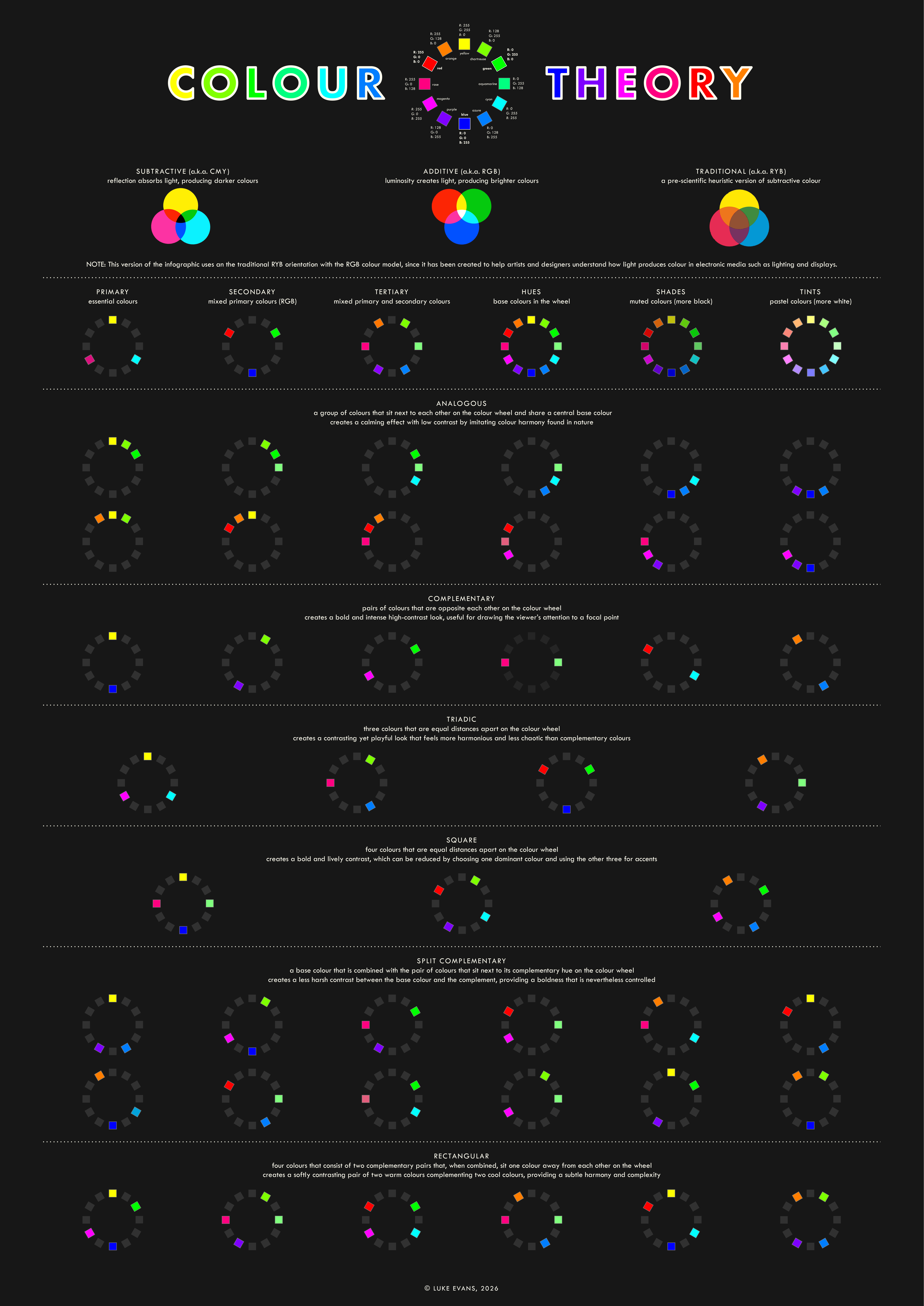 If you’d like a handy one-page version of all this information, you can find it in the infographic below. Like everything else on this page, it comes in two variants to depict the differences between the subtractive and additive models.