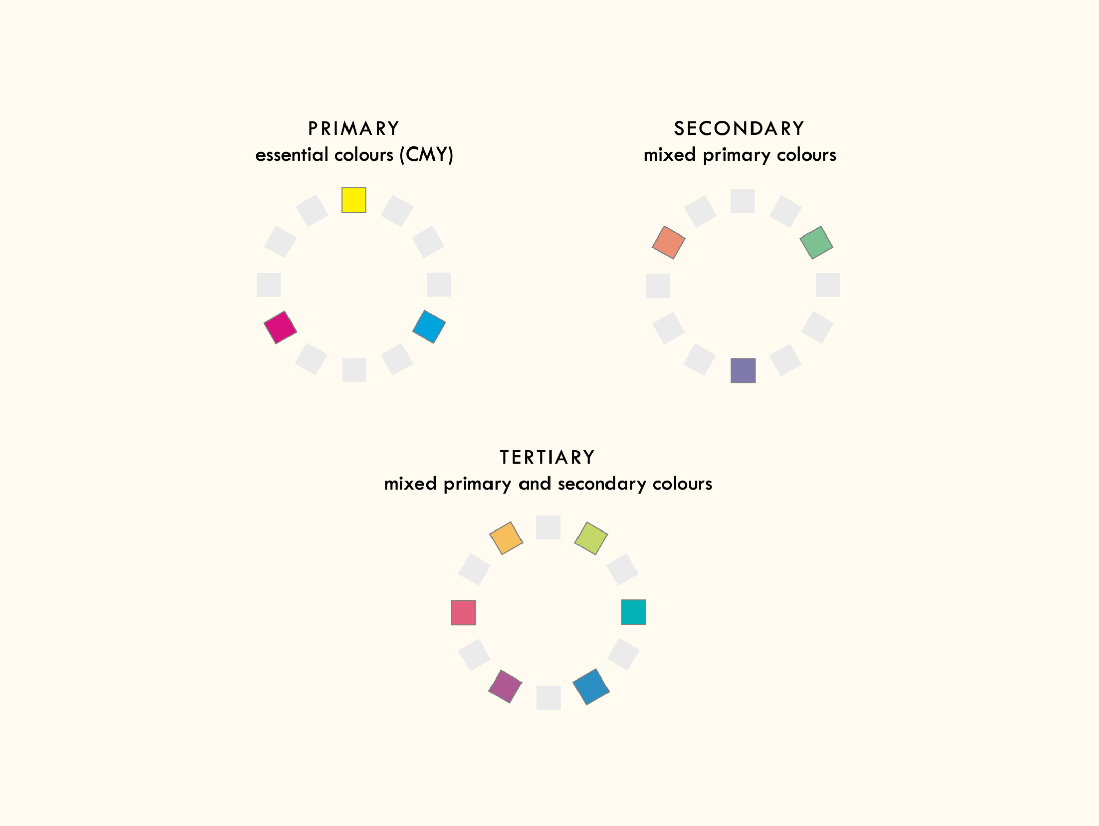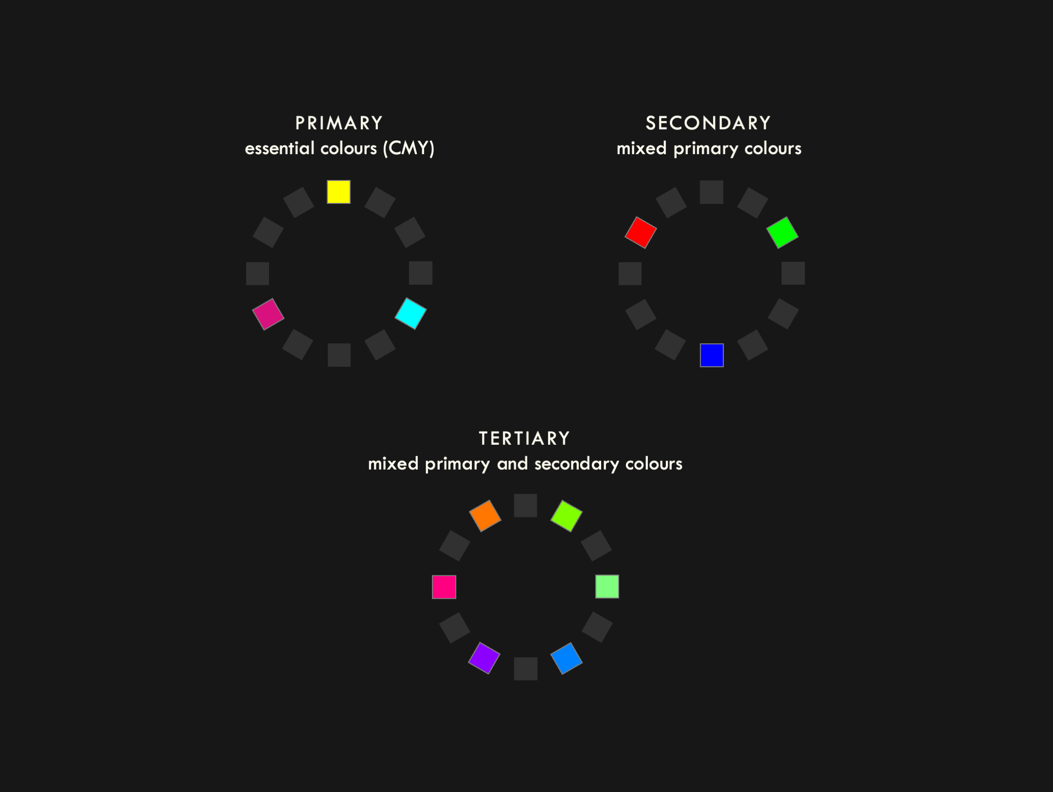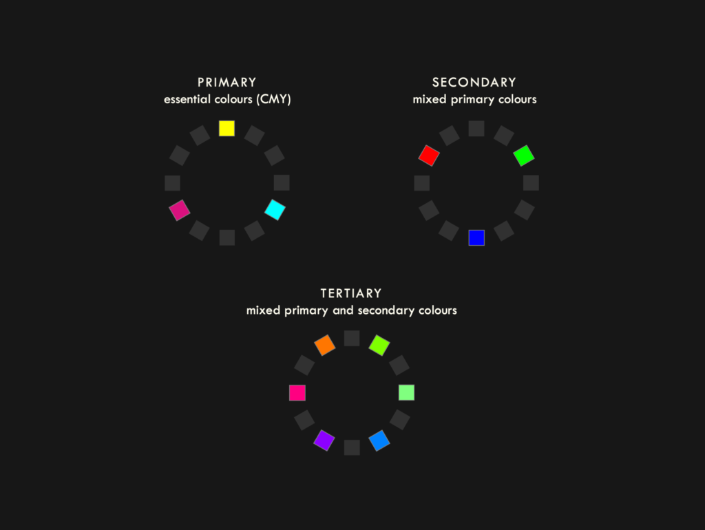 Since both colour mixing models are useful for different applications, the figures used throughout this page are providing in both CMY (with a cream background) and RGB (with a black background).