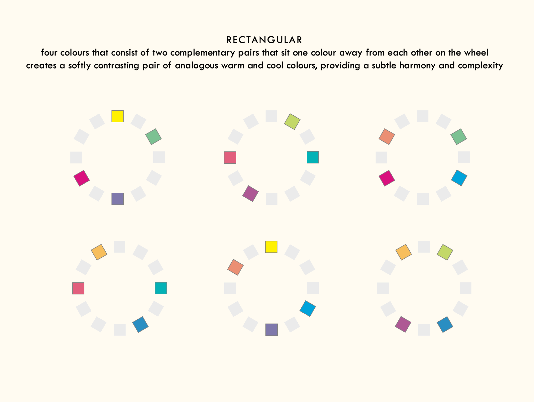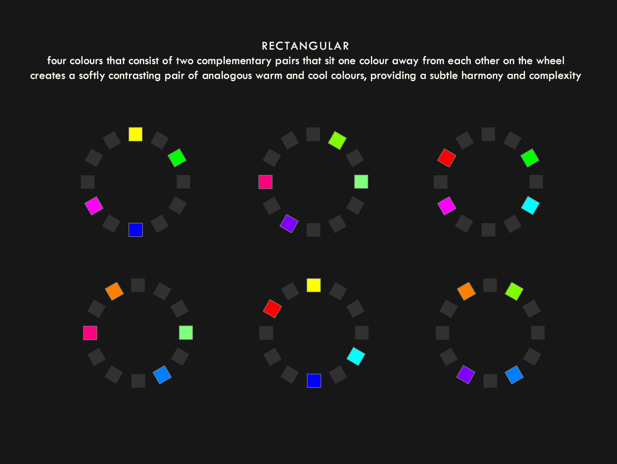 Claude Monet’s Le Grand Canal uses a rectangular colour scheme, balancing tints of cool blue and violet with warm orange and yellow to show the beauty of the sun setting against the light façade of the building. The artist layers these dual complementary colours in rough strokes to create a sense of movement on the water, but the closeness of the pairs provides a calm, harmonious aspect that would otherwise be missing if he used the harsher contrast of a square colour scheme.