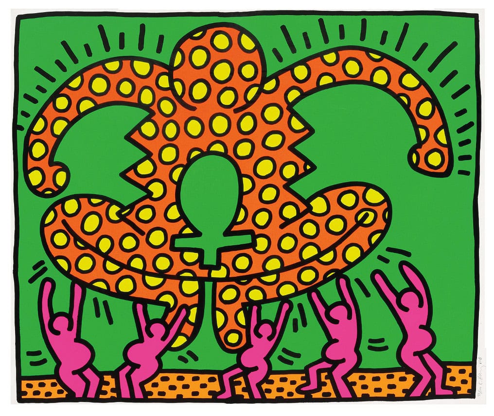 Throughout the five paintings that make up Fertility Suite, Keith Haring uses of the bold clash of complementary colours to draw the viewer’s eye to his depictions of the women of Sub-Saharan Africa, who at that time were experiencing the rapid rise of the AIDS epidemic largely due to negligence among nations in the Global North, perpetuated by racism and homophobia in media narratives around the illness. In this painting, Haring creates a sharp contrast between a bright green background and five pregnant women painted in a magenta hue to create a sense that the women are both part of their environment but also distinct in their own right. Meanwhile, an oversized figure towers above them, painted in more harmonious hues of yellow and red-orange, with an ankh sitting like a keyhole somewhere between its abdomen and loins. While it’s easy to assume the figure is a person, a closer look at the negative space of the background reveals two green hands holding the figure up by its arms, suggesting it is a young child or baby. With this in mind, we could read the yellow polka dots on its body as a representation of an inherited illness, in line with the Fertility Suite’s focus on the AIDS epidemic. Haring’s colours and patterns are clearly influenced by the vibrant Ankara print wrappers often worn by many African women, yet he avoid directly copying these patterns, instead adapting them to fit his own symbols and themes. Despite this dark subject matter, Haring’s choice of complementary colours and comic book-style motion lines (commonly called agitrons, after Mort Walker) suggests that there is an energy and vibrancy to the lives of these women.